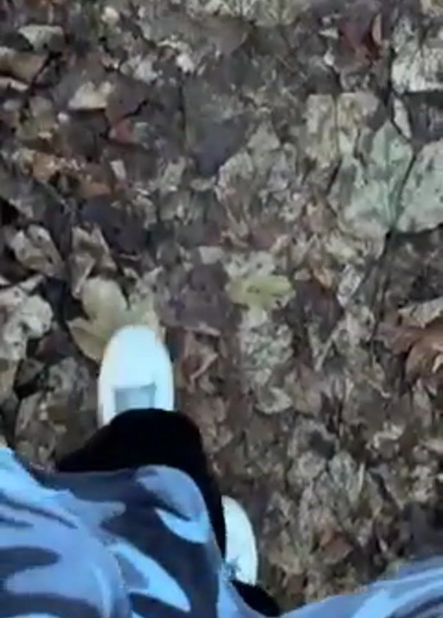 A first-person perspective shows a person walking on a path covered in brown, dead leaves. The person is wearing white sneakers, black pants and blue and grey camo print sweatpants. The leaves appear wet or damp. The person continues to walk forward.