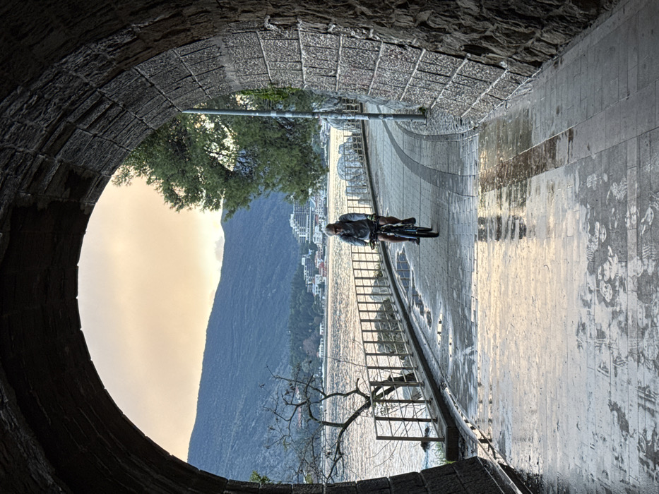 - "The scene is viewed from inside a dark stone archway, possibly part of a tunnel, which opens onto a paved coastal path identified as the Pet Danica Promenade in Herceg Novi, Montenegro" by FM-qIaSs1, licensed under CC BY 4.0