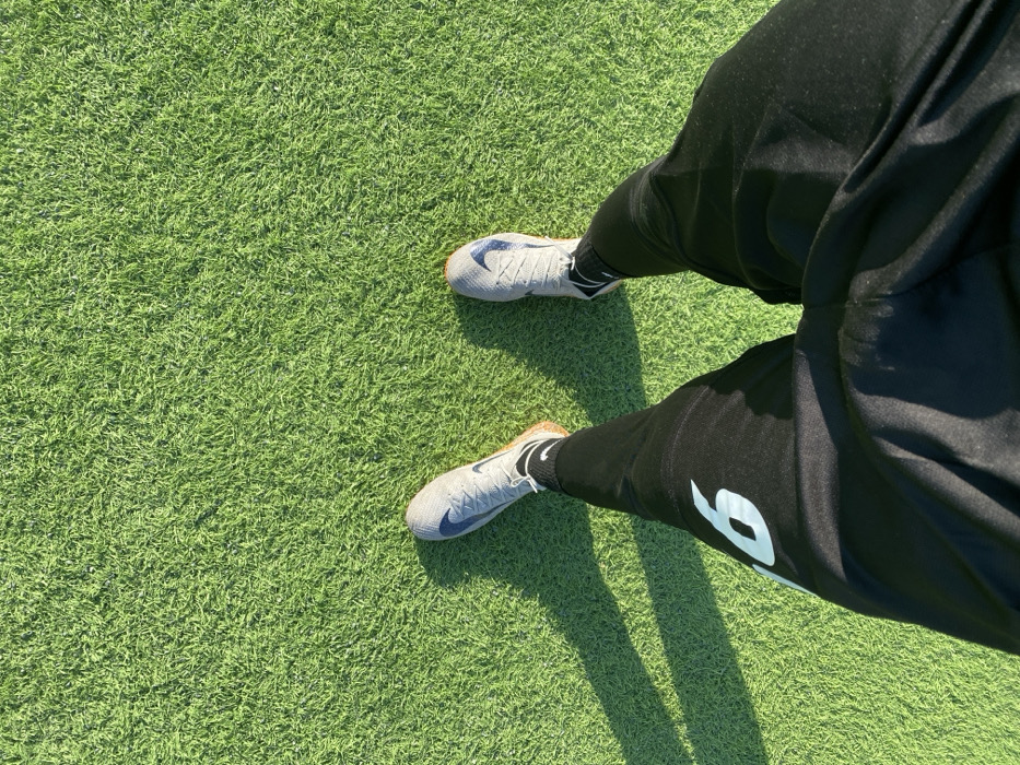 A person wearing black soccer pants with a white number "6" on the right leg and gray Nike soccer cleats stands on artificial green turf. The view is from above, looking down at the person's legs and feet. The person is casting a shadow onto the field.