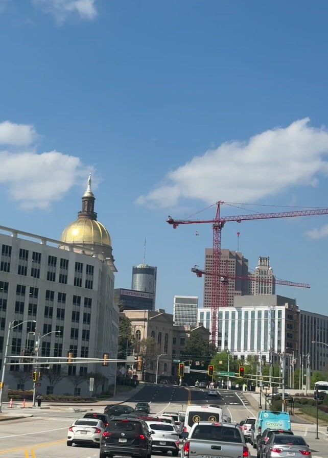 traffic-filled street in a city, likely Atlanta, Georgia, given the prominent Georgia State Capitol building on the left with its gold dome