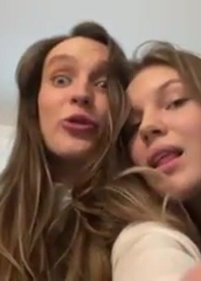 Three young women are crowded close together in front of a camera, facing upward, smiling. The woman in the center sticks her tongue out and laughs heartily. The other two also laugh. Loud music plays in the background.
