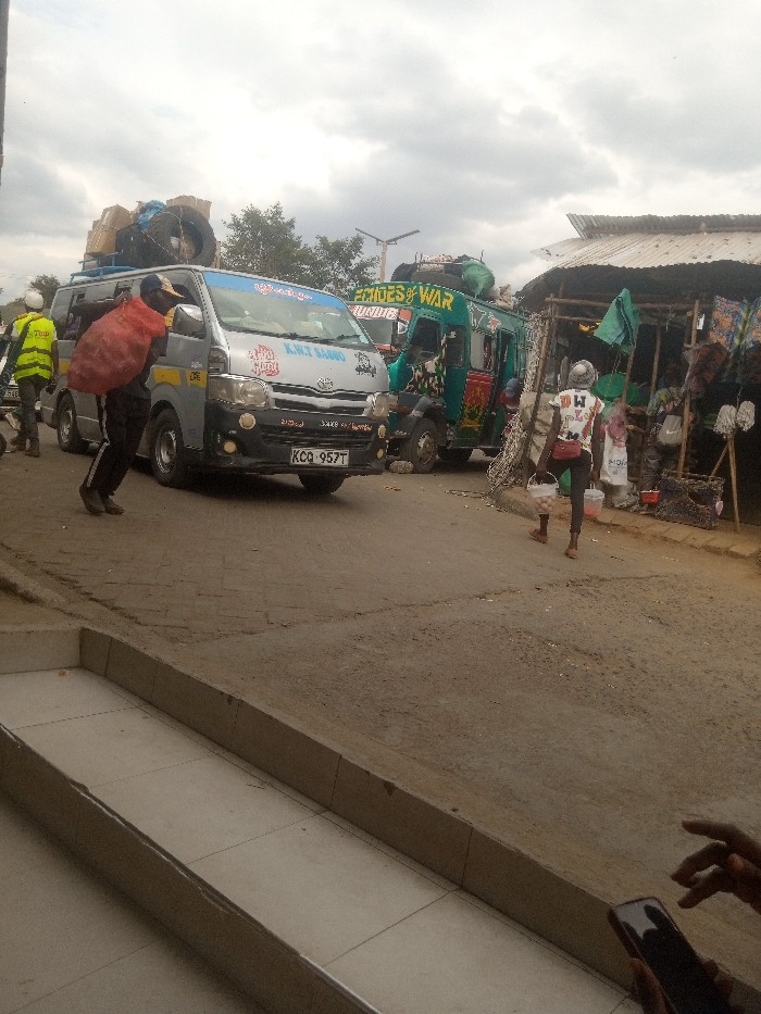 This image depicts a bustling street scene in Kitui, Kenya, characterized by active commerce and transportation under an overcast sky. In the foreground, a tiled step or platform is visible at the bottom left, suggesting the photographer's elevated position. Immediately beyond this, an unpaved, dusty road serves as the primary thoroughfare. On the left side of the road, a grey Toyota Hiace public service van (matatu), bearing the license plate KCQ 957T, is prominently positioned. Its roof rack is heavily laden with diverse cargo, including a spare tire, boxes, and bundled items. The text "K.W.I SAGOO" is visible on the vehicle's front and side. A male individual, wearing a yellow shirt, dark trousers, and a cap, is leaning against the driver's side door of this van, actively handling a large red mesh bag filled with spherical contents, possibly vegetables. Further left and partially obscured, another male individual in a yellow high-visibility vest stands near the rear of the grey van. Behind the grey matatu, a green or teal matatu, possibly a modified truck or larger van, is parked, also featuring a substantial roof rack loaded with goods. The words "ECHOES OF WAR" are visible on its side. On the right side of the road, a series of makeshift market stalls are constructed with corrugated iron roofs, wooden frames, and draped green tarpaulins. Various goods, including textiles and other merchandise, are displayed for sale. A female individual is walking from the right towards the left across the road, passing the market stalls. She is dressed in a light-colored, patterned shirt, dark trousers, and a head covering, carrying a red shoulder bag and a white bucket containing several rounded, light-colored items. The background shows scattered trees and utility poles equipped with streetlights. The sky is largely covered by extensive, grey clouds. Hands holding a black smartphone are visible in the bottom right corner, indicating the perspective of the person capturing the image. The scene conveys an everyday snapshot of a busy urban environment focused on transport and commerce.