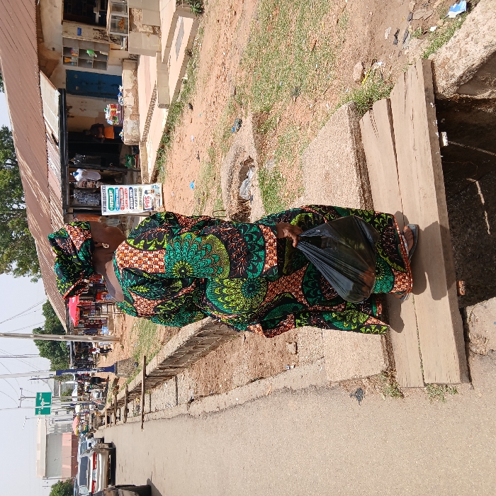 woman wearing a green and black patterned dress and a head wrap, walking on a wooden plank bridge over a drainage ditch. She is carrying a black plastic bag in her right hand. The scene is located in a city in Nigeria. The road in the background is paved and leads toward a series of buildings that appear to be shops. The woman is walking away from the camera toward the shops. There are other people and cars visible in the distance. The environment appears to be dusty and somewhat neglected.