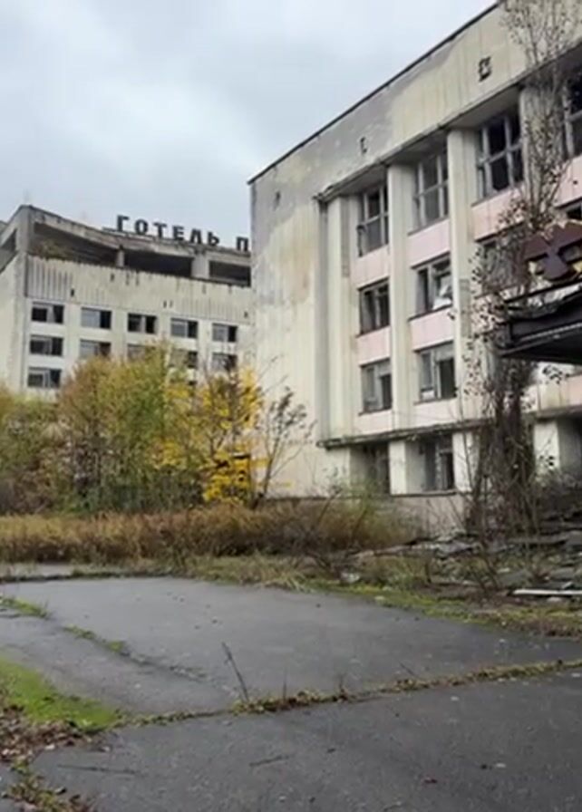 The camera slowly pans up, showing the Polissya Hotel in Pripyat, Ukraine, near the Chernobyl Exclusion Zone
