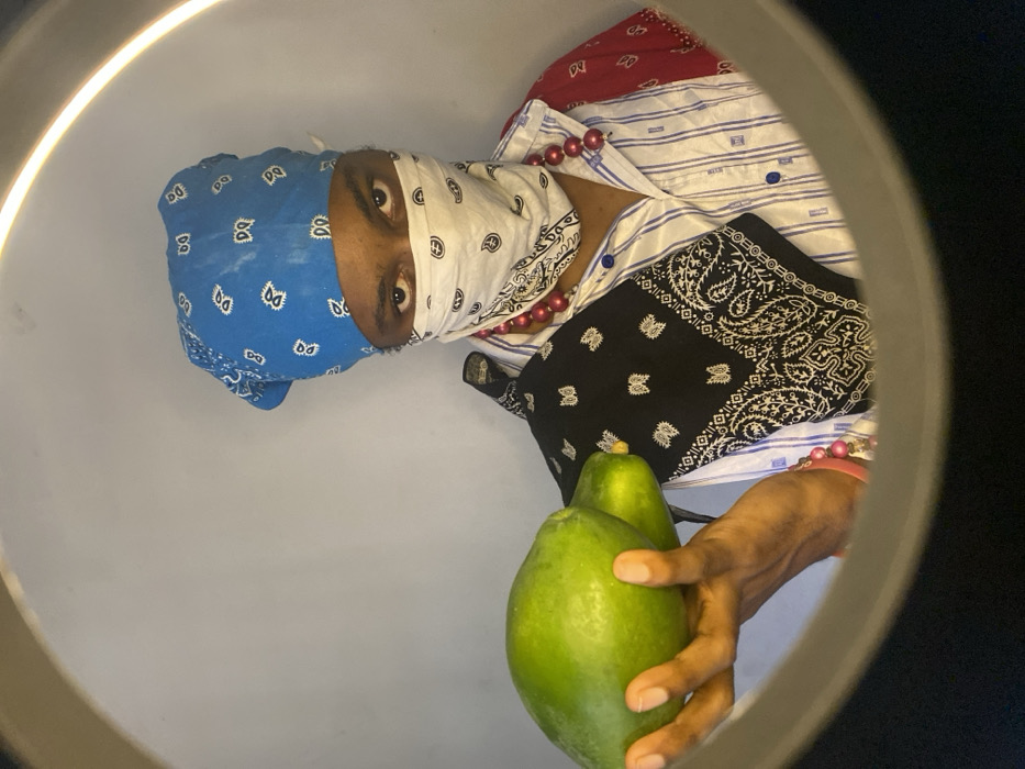 A single individual is depicted in a medium-close shot, centered within the circular aperture of a ring light, against a plain light-grey wall in Ngleshi Amanfro, Ghana. The subject has a dark skin tone and wears a blue bandana with a white paisley pattern on their head. A white bandana with a black paisley pattern covers the lower half of the face, from the nose downwards. The subject's dark brown eyes are visible and gaze directly at the viewer. The individual is wearing a button-up shirt, primarily white with faint blue vertical stripes, and features a red patterned section on the right side of the chest/shoulder. A black bandana with a white paisley pattern is draped over the left shoulder. A necklace composed of red spherical beads is visible around the neck, worn over the shirt, and a pink beaded bracelet adorns the left wrist. The subject holds two green, unripe papayas in their extended left hand, with the larger fruit prominently positioned in the palm. The scene is evenly lit by the ring light that frames the image.