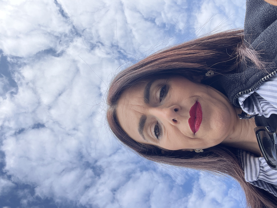 The image displays a female subject, appearing middle-aged, centered against a background of a blue sky scattered with white cumulus clouds