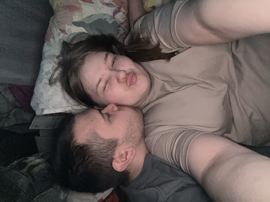The image depicts two individuals in a close-up indoor setting within Ольховка, Russia. A male subject, presenting with short dark hair and facial stubble, wears a dark grey shirt and is positioned on the left, kissing the left cheek of a female subject. The female subject, possessing long brown hair and wearing a light beige shirt, occupies the center-right of the frame. Her right eye is closed in a wink, and her lips are pursed. Her left forearm is visible in the foreground, suggesting she is operating the camera. The background shows textile elements consistent with bedding, specifically a patterned pillow featuring floral motifs, indicating a domestic environment under low light conditions.