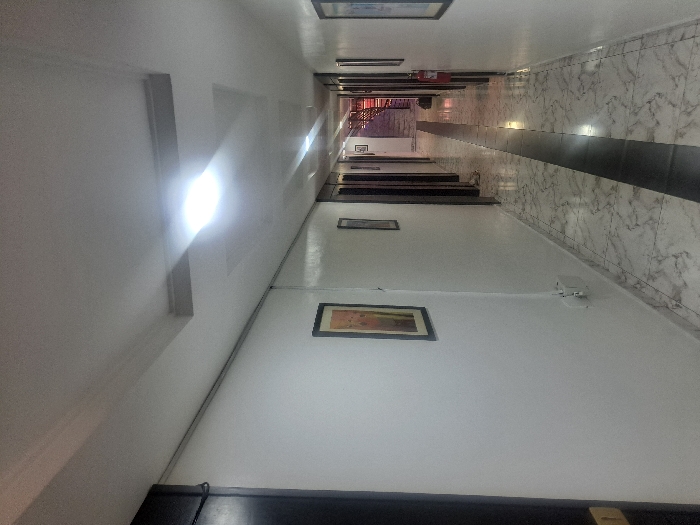 An interior hallway, located in Moba, Nigeria, is depicted. The long corridor features white walls displaying multiple framed artworks. A thin dark conduit runs along the upper left wall. The white ceiling incorporates recessed panels and flush-mounted light fixtures, with one centrally positioned light source brightly illuminating the space. The floor is covered with light-toned, possibly marble, tiles exhibiting dark veining, intersected by a continuous central stripe of dark, rectangular tiles. Dark-colored doors are visible along both walls, suggesting access to individual units. A red fire extinguisher is mounted on the right wall in the distant section. At the far end of the hallway, an ascending metal staircase is partially visible, with several dark objects resting on the floor near its base. No individuals are present, and no actions or interactions are depicted.