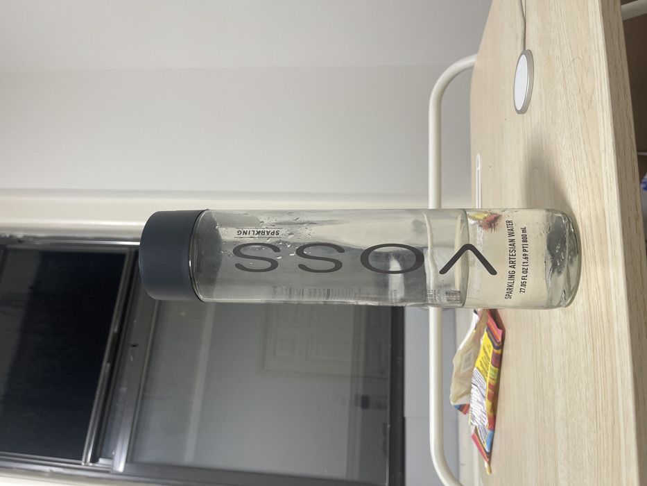 - "A clear, cylindrical Voss brand glass bottle, approximately one-third full of sparkling artesian water, stands upright on a light-colored wooden table" by FM-9ARGK2, licensed under CC BY 4.0