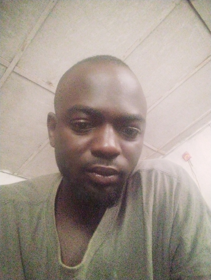 An indoor, close-up, chest-level portrait depicts a single adult male within a building located in Akwanga, Nigeria