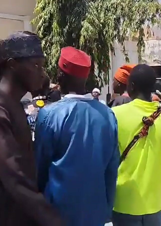 The video depicts a lively outdoor scene with a crowd of people gathered, some dressed in traditional African attire