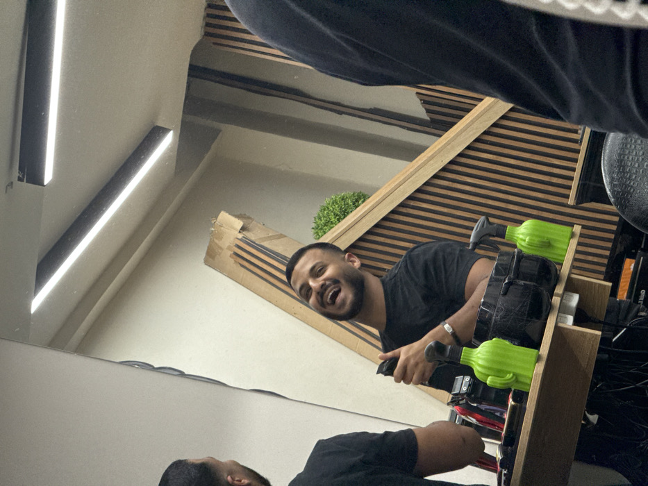 The image depicts the interior of a barbershop in Tel Aviv, Israel, captured via a large mirror reflection. A male subject with short dark hair and a beard, wearing a black t-shirt, is visible in the mirror's reflection, smiling broadly with his mouth open. He holds a black hair clipper in his right hand. In the foreground, a wooden shelf displays various barber tools, including two distinct bright green spray bottles shaped like cacti and a black container. Behind the reflected subject, a wall features vertical wooden slats in alternating light and dark brown tones, framed by a lighter angular wooden structure. An artificial green plant is visible above the slat wall, and a large cardboard box leans against it. The ceiling above features two linear, recessed light fixtures. On the far left, the back of another individual's head and left shoulder, wearing a black shirt, are partially visible in the mirror, presumably the person taking the photograph or another client/barber. The specific street address within Tel Aviv is not discernible.