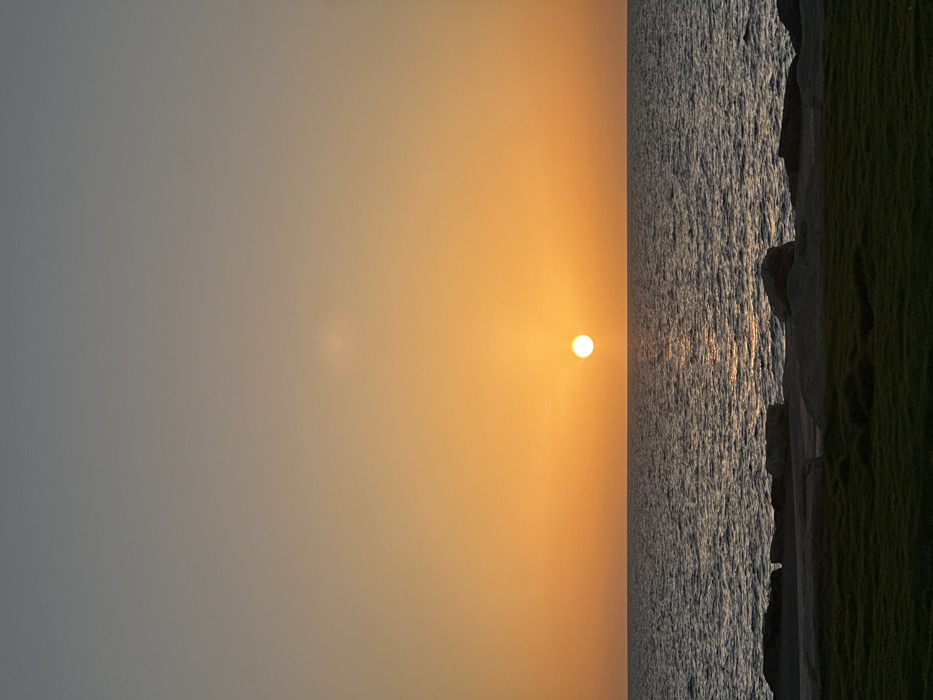 The image displays a sunset over the Mediterranean Sea, viewed from the coastline of Tel Aviv, Israel. The sky, comprising approximately the upper two-thirds of the frame, exhibits a gradient transitioning from a light gray-blue at the zenith to a vibrant orange-yellow hue near the horizon. The sun, a distinct, bright white-yellow circular disc, is positioned slightly left of the image's vertical center, resting directly above the sea's horizon line. A faint, diffuse circular light anomaly is visible higher in the upper-mid sky. The sea occupies the middle third of the image, appearing dark blue-gray with subtle surface ripples, and displays a shimmering path of reflected sunlight extending from the sun towards the foreground. The lowest portion of the image, approximately one-tenth, features a dark green, somewhat patchy grassy area. Immediately bordering the sea and preceding the grass, a horizontal line of irregular, light-colored rocky or concrete formations is present. No people, vehicles, or specific man-made structures are visible.