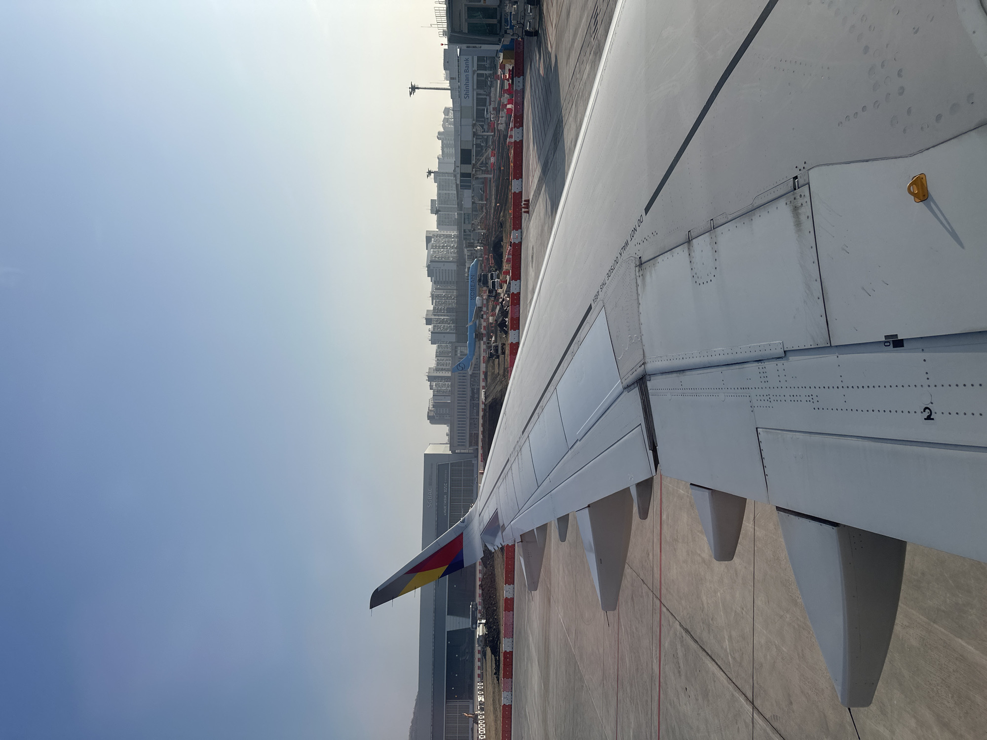 The image depicts an exterior view from an aircraft window on the tarmac of Gimpo International Airport (RKSS) in Seoul, South Korea, under bright daylight. The primary subject is the right wing of an Asiana Airlines aircraft, identifiable by the distinctive red, yellow, and blue segments on its winglet. The wing occupies the mid-ground, extending diagonally from the lower left towards the upper right, displaying its metal structure, rivets, and a reversed "DO NOT WALK OUTSIDE THIS AREA" instruction. Beyond the wing, the scene includes a gray concrete tarmac with red and black markings. A ground work area is demarcated by red and white striped barriers, containing piles of earth and debris. In the mid-distance, a blue Korean Air aircraft is parked near an airport terminal. Several ground vehicles are present on the tarmac. Airport infrastructure visible in the background includes a large hangar labeled "SGBAC" and "AVJET ASIA HAC," and another building featuring "Shinhan Bank" signage with an attached jet bridge. A clear blue sky fills the upper frame, and a distant urban skyline of multi-story buildings is visible beyond the airport facilities. No human figures are clearly identifiable.