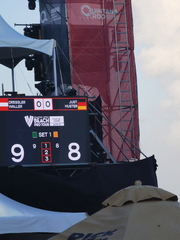 scoreboard displaying the score of a beach volleyball match at the Playa del Carmen, Mexico location (20