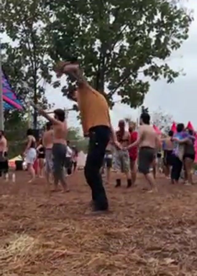 crowd of people at an outdoor event on what appears to be a muddy ground covered in hay. Many are shirtless, dancing or moving to music, and some are partially clothed. There is a person in the foreground wearing a yellow shirt and dark pants who is actively dancing and gesticulating with a stick-like object. The surroundings include trees and decorated structures with colorful flags, indicating a festival or outdoor gathering.