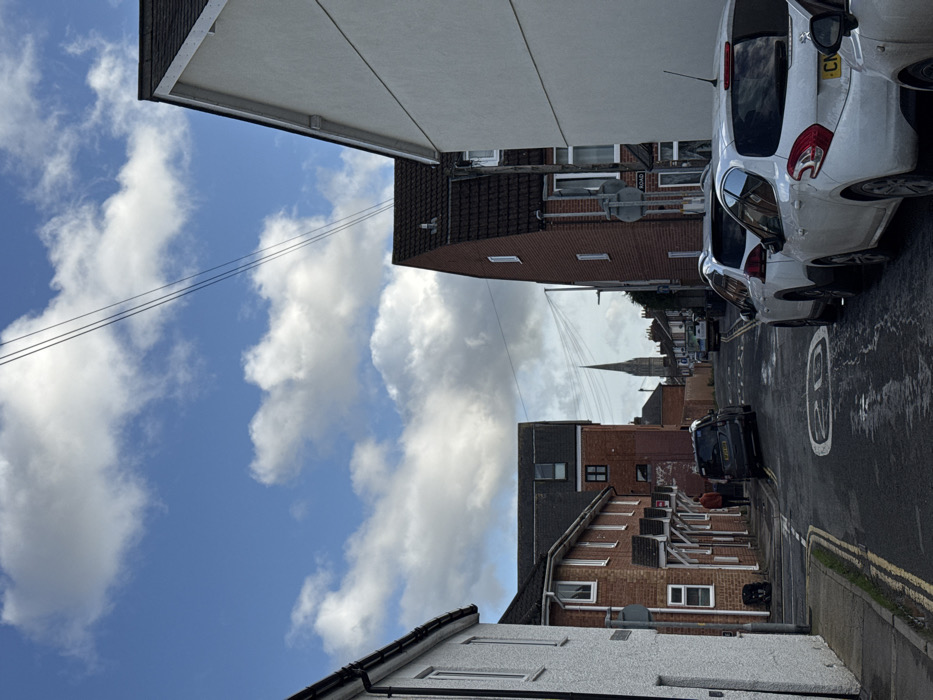 A street view with houses and buildings on either side, converging towards a distant church spire. White cars are parked on the right side of the road. The sky is visible with blue patches interspersed with white clouds, and power lines stretch across. A black car is visible down the street, and the road has painted speed limit markings.