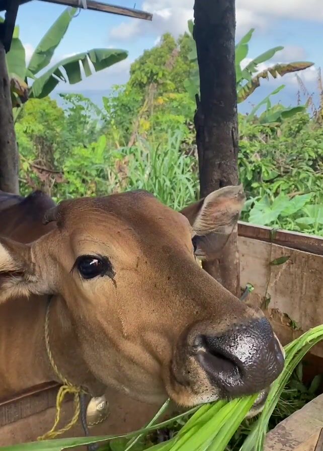 In a close-up, low-angle shot, a brown cow is eating handfuls of grass in a wooden pen. The cow's face fills much of the frame, with its wet black nose, brown eyes, and pointed ears clearly visible. A hand outside the pen offers more grass, which the cow eagerly consumes. The pen appears to be a simple wooden structure, set against a backdrop of lush green vegetation, including banana trees, under a bright, partly cloudy sky. The setting suggests a rural or agricultural environment. The camera remains stable throughout the shot.