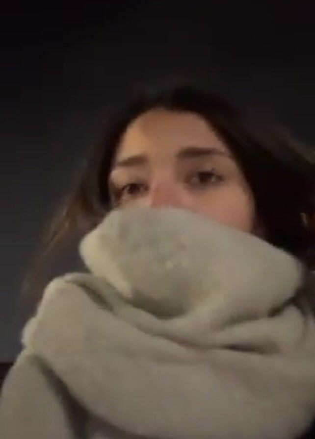A woman with long brown hair and fair skin wearing a light gray scarf pulled up over her nose and mouth looks at the camera. She is holding the scarf in place with her hand. The background is dark, possibly at night.