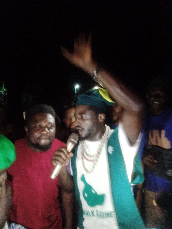 A man with a microphone, wearing a hat and heavy chain, stands in a crowd. He has one arm raised. To his left is a man in a red shirt. Behind the first man are several indistinct faces. To the right, a man in a blue shirt is smiling broadly. The overall lighting is dim. The man with the microphone wears a white shirt with a green design. The shirt reads "Walk Grips."