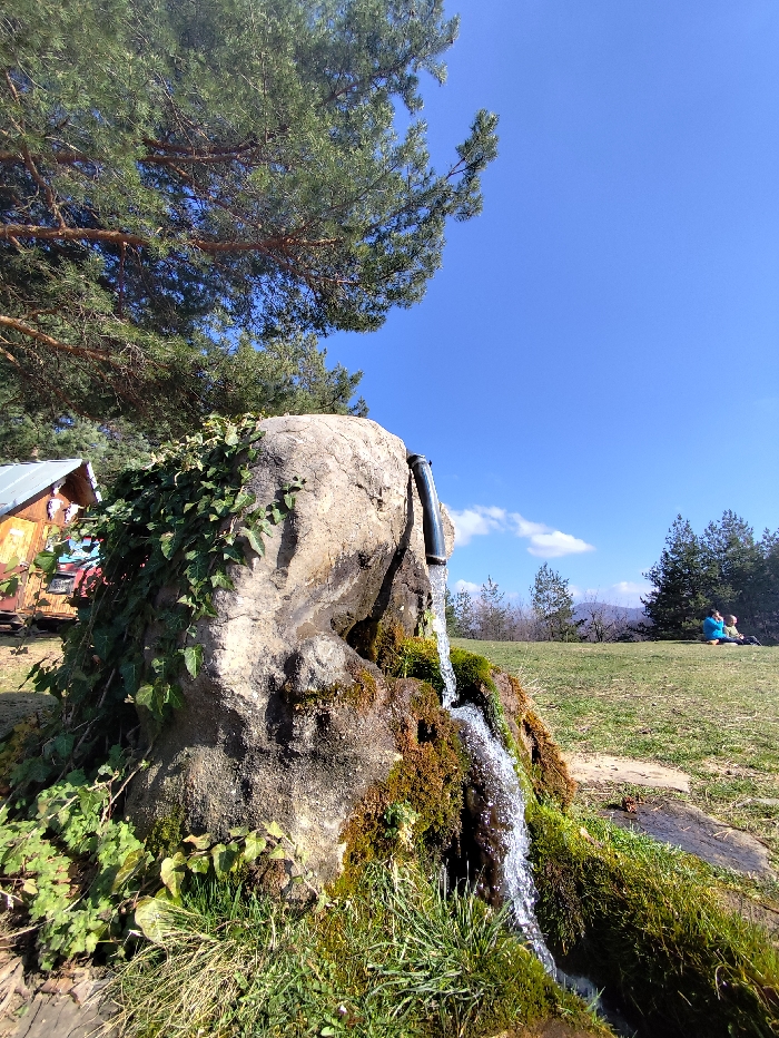 The image displays an outdoor scene in Маруцековци, Bulgaria, under a clear blue sky with scattered white clouds. In the foreground, a large, light-colored rock functions as a water source. A dark pipe extends from the upper-center of the rock, emitting a continuous stream of clear water that flows downwards. The lower part of the rock and the surrounding ground are covered in dense green and brown moss, interspersed with green grass, over which the water cascades. Green ivy partially covers the left side of the rock. To the far left, behind the rock, a fragment of a rustic wooden structure, featuring reddish-brown and blue elements, is visible. The upper-left quadrant of the frame is dominated by the green needles and brown branches of a large pine tree. In the background, a wide expanse of green grass slopes gently upwards towards a distant treeline. Two individuals are observed seated or reclining on this distant grassy slope; one is wearing blue apparel, and the other appears to be in lighter clothing. Faint hills are visible on the horizon. The scene is brightly illuminated by natural sunlight.