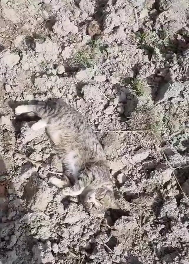gray tabby cat lying on its back on a patch of dry, cracked dirt. A person wearing black pants and dark blue shoes steps into the frame, standing near the cat. The cat appears motionless. The ground is uneven and clumpy, with some small patches of sparse green vegetation. The lighting suggests it's daytime.
