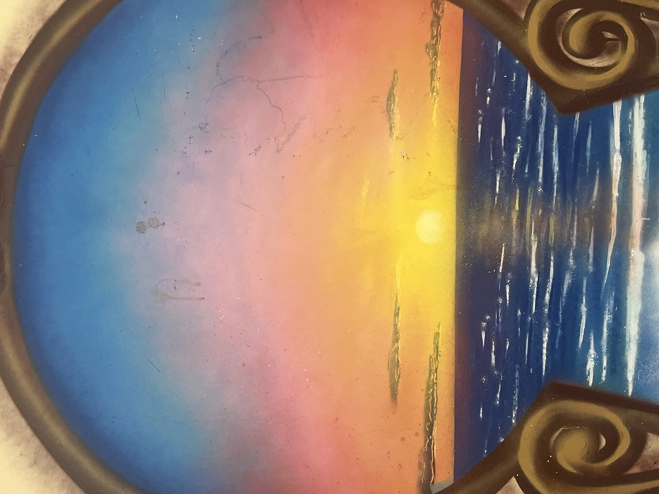 An image displays a mural or artwork depicting a vibrant sunset over a body of water, framed by a dark golden-brown archway with decorative scrollwork at the lower corners