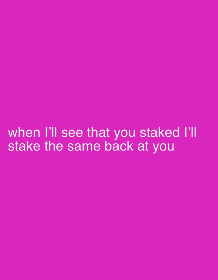 A vibrant purple background fills the frame. The text "when I'll see that you staked I'll stake the same back at you" is centrally located in the lower portion of the image. The text is a simple, sans-serif font in white, creating a strong contrast against the saturated background. The phrase implies a tit-for-tat reaction, suggesting a retaliatory measure related to staking.
