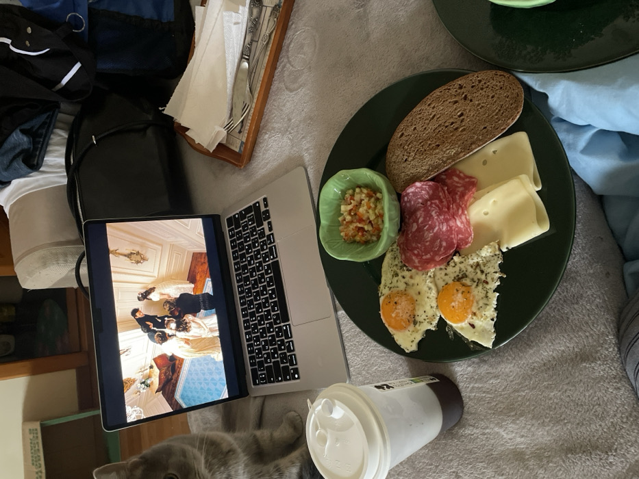 In a domestic setting within the city of Dnipro, Ukraine, a light gray textured surface, possibly a blanket or comforter, serves as the foreground. A silver MacBook laptop, displaying a scene with multiple individuals in formal attire within an elegant interior, is positioned centrally. To the left of the laptop, the head and upper body of a gray tabby cat are visible, observing the scene. To the right of the laptop, a dark green circular plate holds a meal consisting of two fried eggs topped with herbs, multiple slices of salami, three folded slices of light-colored cheese, and a slice of dark bread. A small, light green, leaf-shaped bowl containing finely chopped vegetables is situated at the top of the plate. Adjacent to the plate on the left, a white disposable cup with a lid contains a dark beverage. Further to the right in the mid-ground, a wooden tray holds a silver fork, knife, and white paper napkins. The background features a light-colored furniture piece, possibly a couch or headboard, topped with various dark-colored bags and clothing items. A wooden door frame and a light-colored wall are also partially visible in the distant background.