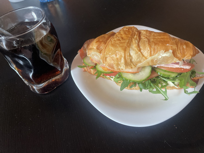 An overhead view displays a meal arranged on a dark, matte tabletop surface in the city of Burgas, Bulgaria. A white, irregularly shaped plate holds a golden-brown croissant sandwich, horizontally sliced and filled. The visible fillings include layers of light pink ham, circular red tomato slices, green cucumber slices, and green arugula leaves, all interspersed with a white creamy spread. To the left of the plate, a clear glass with a distinctive wavy or irregular contour contains a dark brown, carbonated beverage, exhibiting visible effervescence. No individuals are present in the scene.