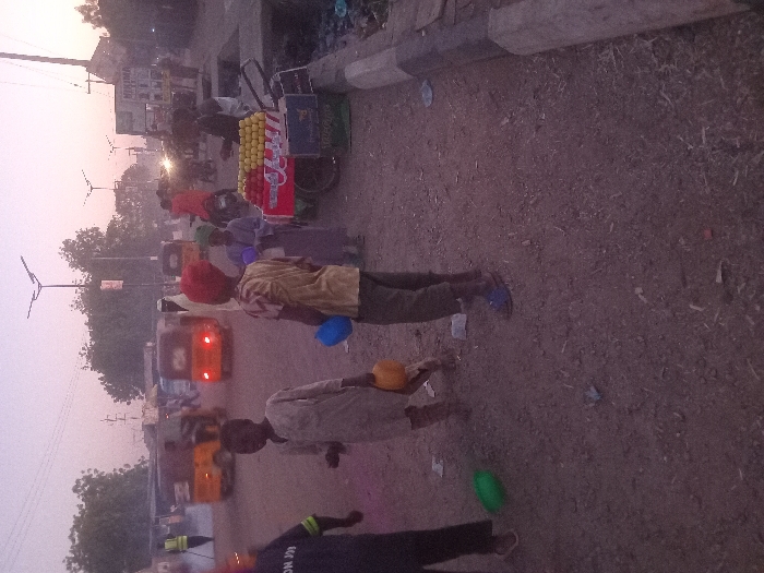 Two children are walking along a dirt road or sidewalk next to a street. One child has a blue bowl or hat, the other an orange one, both held in their right hands. A third child follows behind. A food cart with fruit, possibly oranges, is visible on the side of the road. Traffic with cars and other pedestrians are in the background. The photo appears to be taken during the day, possibly in the early morning or late afternoon given the lighting.