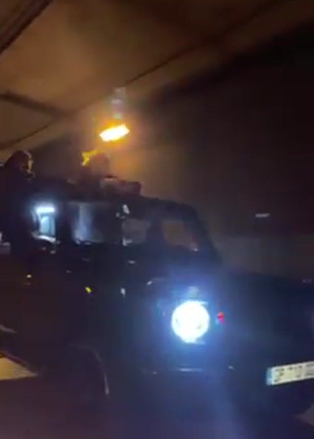 A dark, possibly black, Mercedes-Benz G-Wagon drives through a tunnel. The car's headlights and turn signals are illuminated. Two people are visible, one driving and the other standing up out of the sunroof. The person in the sunroof appears to be wearing a jacket. The car's license plate is partially visible. The tunnel has lights on the ceiling. The video appears to be taken from another moving vehicle.