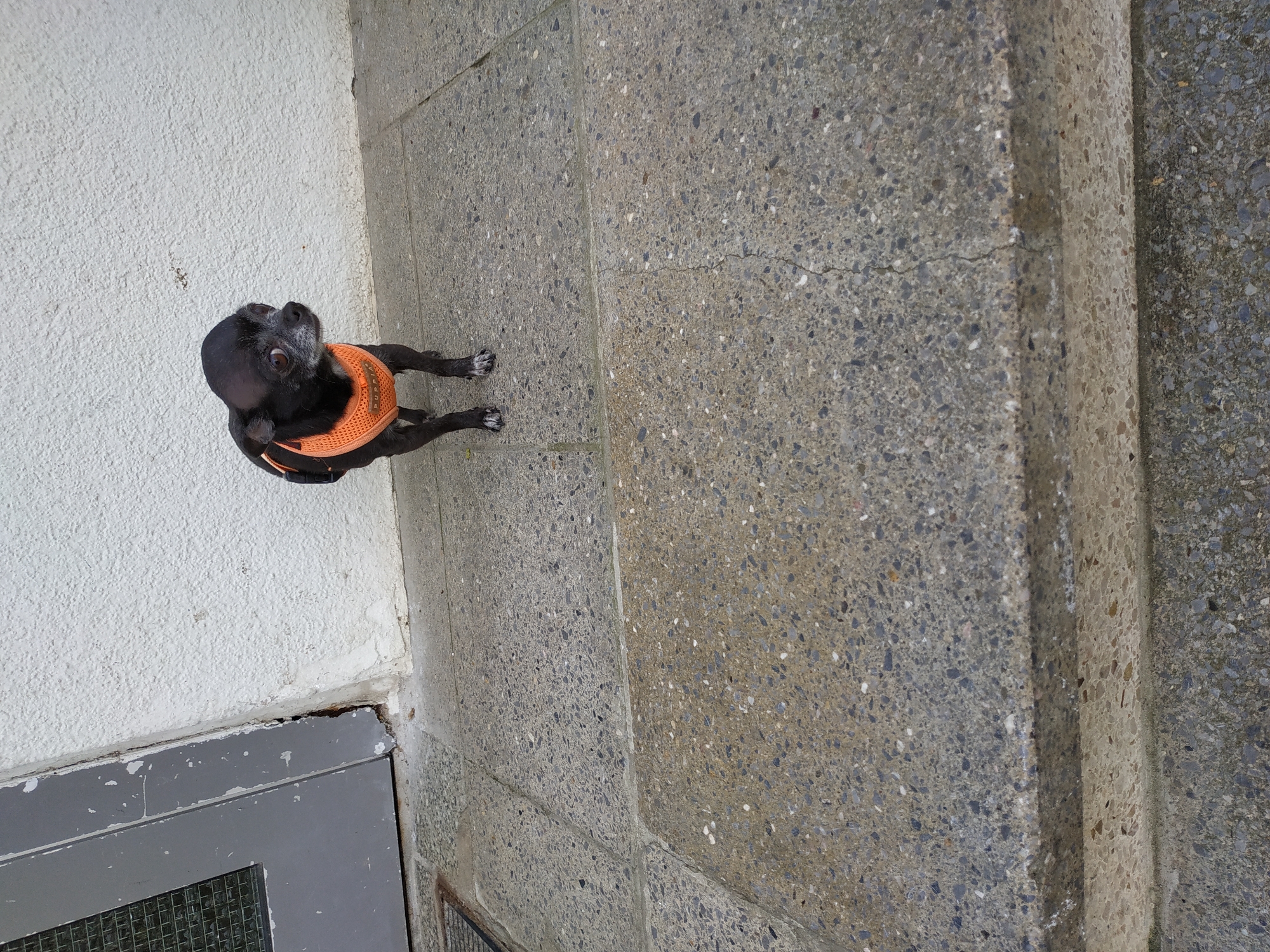 This image depicts an outdoor scene at a building entrance in Dortmund, Germany. The central subject is a small, black, short-haired dog, consistent with a Chihuahua, standing on a paved area. The dog wears a bright orange harness, clearly displaying the brand "PUPPIA." It possesses light-colored eyes and distinct white markings on its front paws. The dog's head is turned slightly to the right, looking off-frame. The background features a textured, off-white stucco wall exhibiting minor dirt or discoloration. To the left of the dog, a weathered grey door or doorframe is visible, characterized by peeling paint and a gridded window section. The ground consists of large, light grey concrete pavers, embedded with various dark and light aggregate, showing visible grout lines and minor surface cracks. A concrete step, identical in material to the paving, is prominent in the immediate foreground. The environment suggests a utilitarian building exterior displaying signs of weathering and general use. No specific landmarks within the image permit precise identification of a street or particular building in Dortmund.