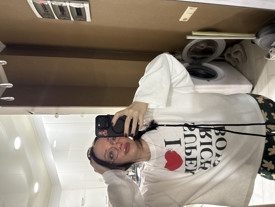 A mirror selfie shows a person with glasses and dark hair wearing a white t-shirt with the upside-down text "I Love Rich Boxer." The background reveals a bathroom scene, including a white washing machine and tile flooring. Part of a kitchen is visible in the reflection, with white cabinets and modern lighting. The person is holding a smartphone to capture the image.