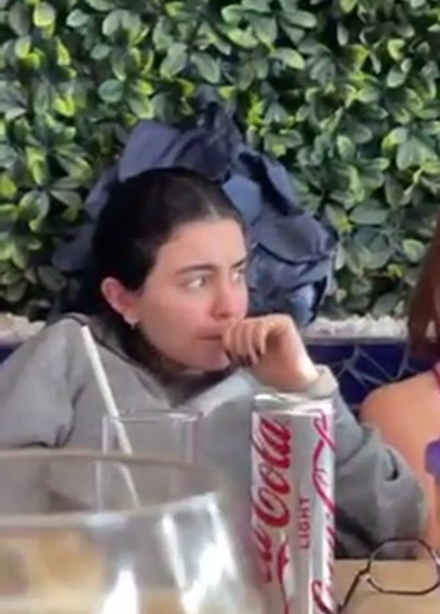 two women sitting at a table outdoors. The woman in the foreground is looking off to the side, with her hand resting on her chin, her expression suggesting she's contemplative or possibly concerned. A can of Coca-Cola Light and a glass with a straw are near her. The second woman is drinking from a colorful cup with a straw. In the foreground, a glass of dark liquid with a foamy top is visible. The background consists of a lush green wall.