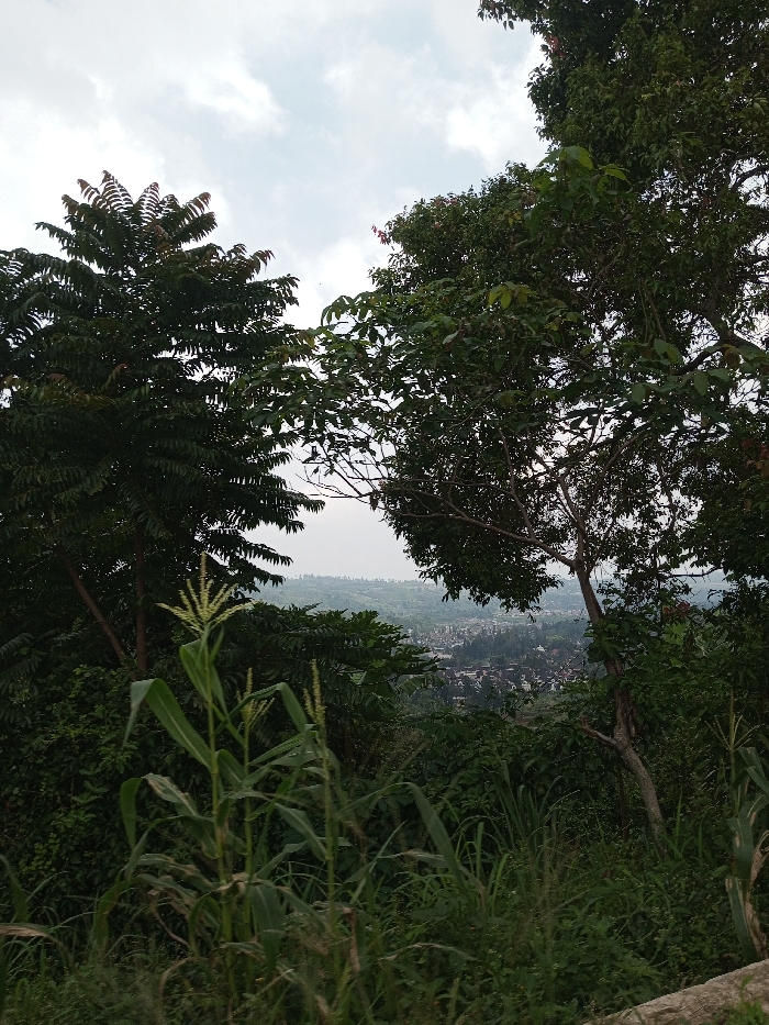 The image displays an elevated view overlooking a valley, identified as the city of Vieng Phouka, Laos, under an overcast sky. In the immediate foreground, dense green vegetation is present, featuring prominent tall grasses, including a corn stalk with a visible tassel slightly left of center. The midground is dominated by dark green foliage from several trees, which frame the distant scene through a central opening. The tree on the left exhibits large, possibly compound leaves, while the tree on the right has smaller, denser leaves. In the background, a cluster of buildings with dark roofs indicative of a settlement is visible in the valley below. Beyond the settlement, hazy, undulating terrain extends towards the horizon. No individuals or specific actions are discernible.