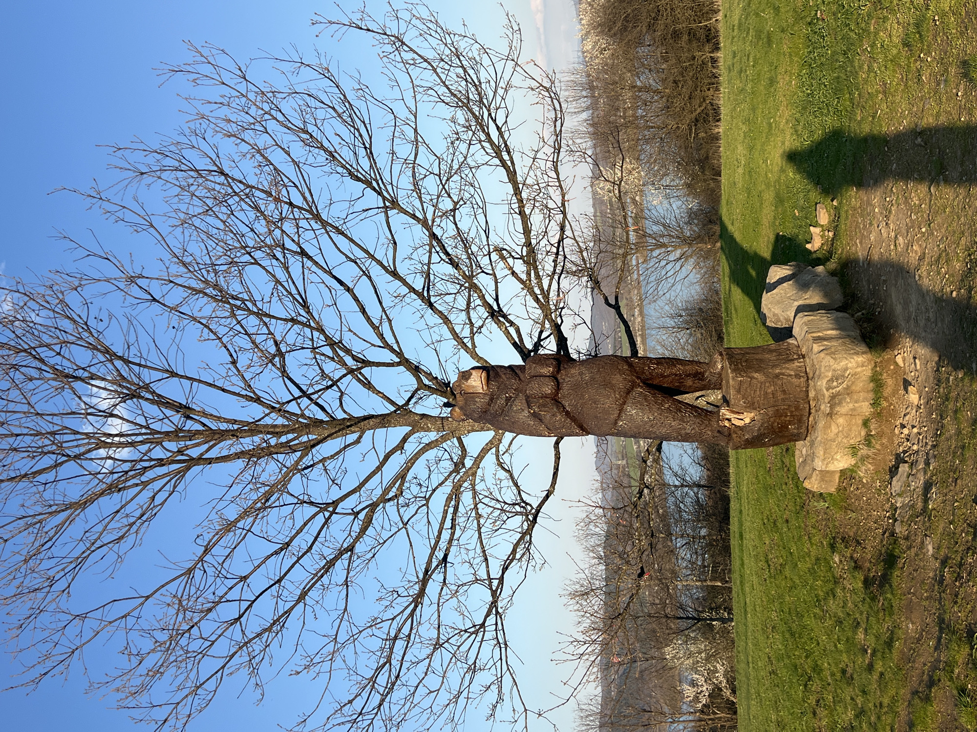 A tree with bare branches dominates the view against a clear blue sky. The tree trunk appears to be carved, possibly into the shape of a bear. The surrounding area is a grassy field, with a path on the right. The background reveals trees and a hint of water, possibly a river or lake. The location is Gardevtsi, Bulgaria.