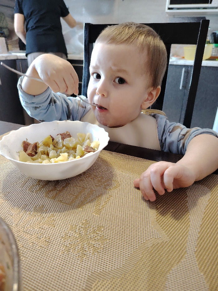 A young child sits at a table, wearing a bib and eating from a white bowl. The bowl contains what appears to be cubed potatoes and sausage. The child holds a fork, bringing food to their mouth. Their expression is focused. A person stands in the background near a sink, out of focus. The table has a textured, woven placemat, and a dark chair is behind the child. The overall setting seems to be a home kitchen.