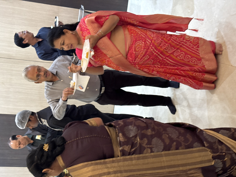 Several individuals are enjoying a meal indoors. A woman in a red saree holds a plate and fork. A man in a grey shirt stands next to her, also holding a plate and fork. Behind them, another man in a blue shirt stands with his head tilted. Further down the frame, a person wearing a cap and jacket is visible. A woman in a dark saree with a gold design is in the foreground.