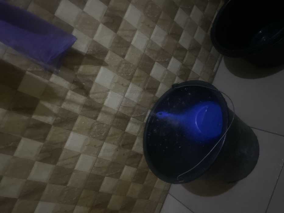 Two black buckets sit on a tiled floor. One bucket has a blue plastic scoop or cup inside. The tiles on the floor have a checkered pattern with alternating light and dark squares. A purple object is slightly visible on the left side of the floor.