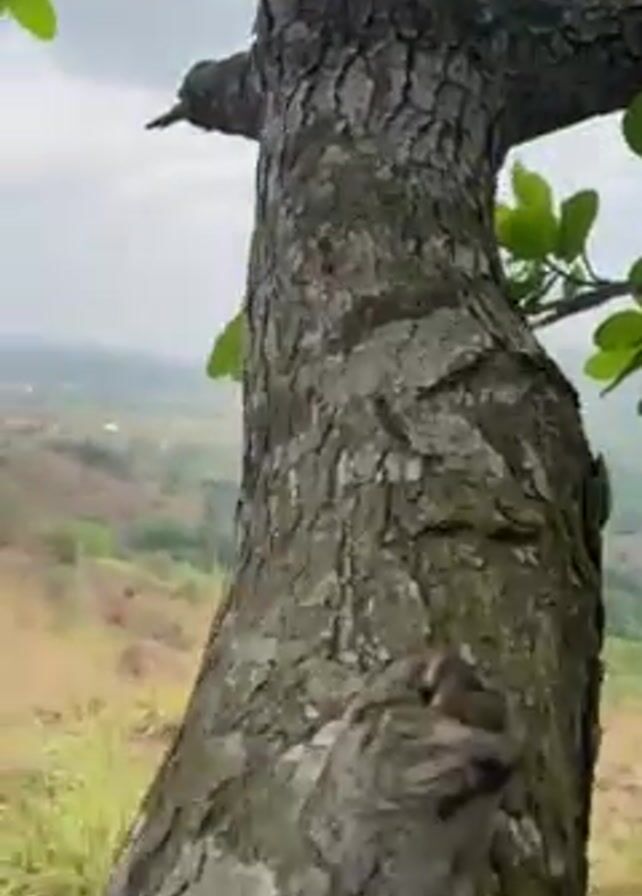 The video starts with a shot of a tree and the view from what appears to be a high altitude, potentially a hilltop or mountain. The camera then pans down along the tree trunk towards the ground. The final shot shows a close-up of a dark, possibly rotting piece of wood, with a hand pointing at an area within the wood. The area being pointed at appears wet and may contain some type of residue or substance.