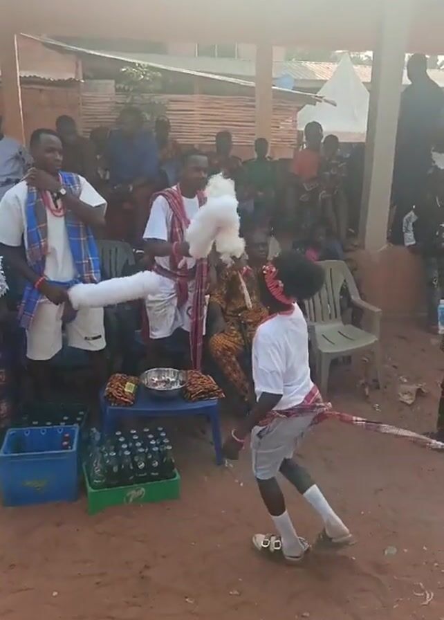 child dressed in a white shirt and grey shorts dancing in front of a small crowd. The child has a striped sash around their waist and a matching headband. They are holding a long, decorated stick or rod. Two men stand nearby, dressed in traditional attire, including white outfits, colorful sashes, and feathered fans. One man also wears a beaded necklace. The men seem to be accompanying the child’s dance. Behind them, a group of people are seated under a covered area, watching the performance. To the side, there is a small blue table with drinks and food items. The ground is dirt, and the overall setting appears to be an outdoor celebration or cultural event.
