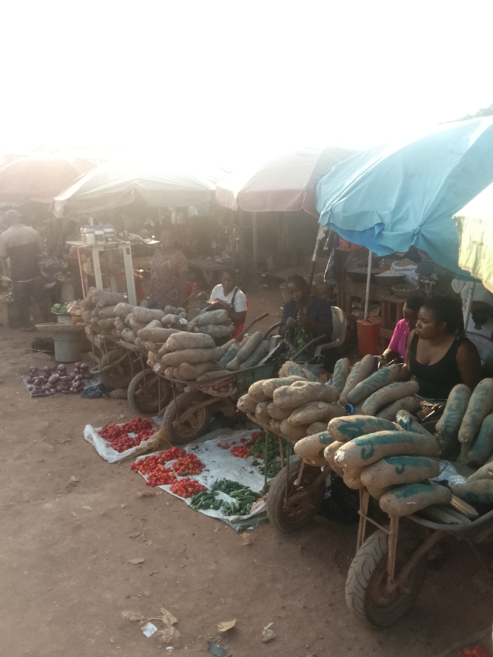 A vibrant outdoor market scene presents a variety of produce. Wheelbarrows overflow with yams, some marked with blue ink. Onions, tomatoes, and green vegetables are spread on white cloths. Several women are seated near the produce, likely vendors. Tents or umbrellas provide shade over the stalls, while other people mill about in the background. The scene is bathed in bright sunlight, suggesting midday.