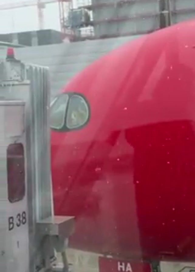 exterior of a red and white Swiss International Air Lines plane during snowy weather, as viewed from inside a jet bridge. The camera pans slightly along the side of the plane, revealing a few of its windows, as well as the word "Chäserrugg" in white lettering. The jet bridge is labeled "B 38". In the background, a construction site with scaffolding and a crane is visible. Snowflakes are visible on the window and the side of the plane.