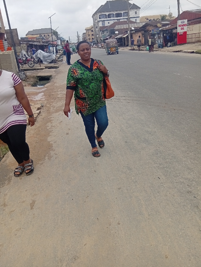 The image depicts a street scene in Umuode, Nigeria, under an overcast sky. In the immediate foreground, a concrete sidewalk occupies the lower portion of the frame. A woman is prominently featured, walking towards the viewer, positioned slightly right of the frame's center. She is wearing a short-sleeved top with a vibrant green, black, and orange geometric pattern, blue jeans, and black open-toed sandals. She carries an orange shoulder bag on her left shoulder and holds a small white object in her right hand. Her facial expression suggests a slight smile. To her left, partially visible, is the torso and legs of another individual, walking away from the viewer. This person wears a white top with purple horizontal stripes, black pants, and patterned open-toed sandals. The midground features an asphalt road running diagonally from the lower right to the upper left. Along the left side of the road, there is a rough dirt shoulder leading to a concrete gutter/drain. Beyond this, a series of makeshift structures with corrugated metal roofs are visible, along with parked motorcycles, some covered with tarpaulins. Construction blocks are also present near the sidewalk. A tall street light pole stands on this side. Further down the road, several individuals are walking or standing. On the right side of the road, a line of single-story shops or stalls with corrugated metal roofs is visible. A prominent red and white sign bearing the text "ROSOCKS OIL" is affixed to one of these structures. In the background, behind the shops, multi-story buildings with various architectural details, including balconies, rise against the sky, indicating a dense urban or semi-urban environment. A green and yellow motorized tricycle (keke Napep) is visible on the road in the distance, near the center. The overall impression is an active street environment.
