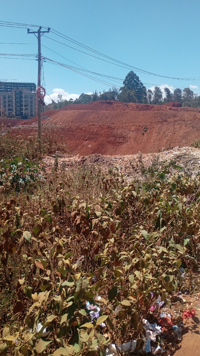 A landscape shot depicts a construction site. Red soil forms a backdrop with some trees. Below it, there is a messy layer of dry reeds. In the foreground, vegetation is overgrown and dry. Litter is scattered among the bushes. A tall building is seen on the left side. Overhead power lines are stretched across a clear blue sky.