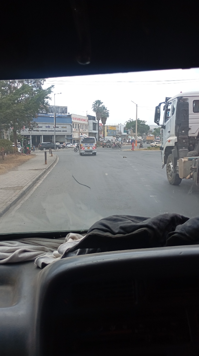 The image is taken from inside a vehicle, looking out at a street scene. A large truck is on the right side of the road. Across the street, there is a police vehicle, several motorcycles, and other cars. Buildings line the street, with signs visible on some of them. There are also trees and a palm tree. The sky is overcast. The dashboard of the vehicle is visible in the foreground.