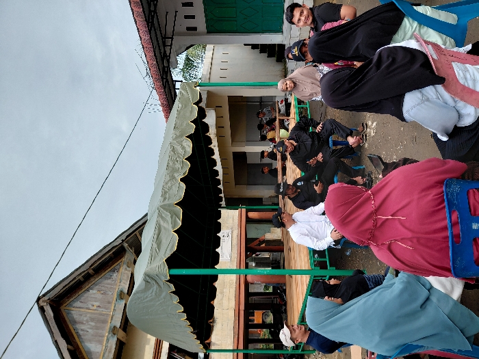 A gathering of people is seated outdoors under a tent-like structure. Most individuals are seated in blue plastic chairs. Many are wearing traditional Islamic clothing, including hijabs in various colors. A few men wear casual clothing. A building is visible behind them with doors and windows. The sky is overcast.