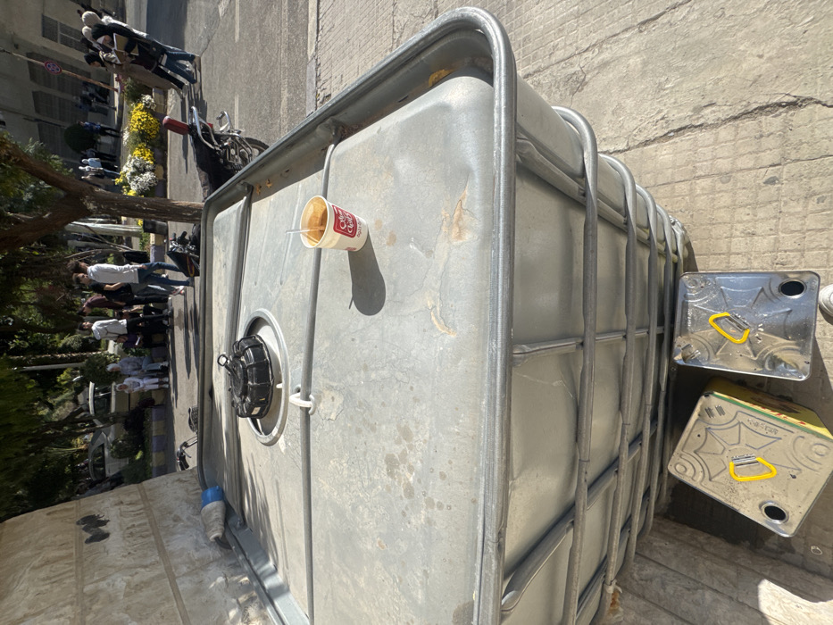 The image depicts an outdoor urban scene in Rukn ad-Din Municipality, Syria, illuminated by bright sunlight. In the immediate foreground, a large, grey intermediate bulk container (IBC) with a metal cage frame occupies the lower half of the frame. Its top surface exhibits dirt, discolored patches, and rust stains. A black, circular screw-top cap is located on the top surface, slightly left of center. To the right of the cap, a white paper cup, bearing "Café Cuba" branding, rests on the IBC surface, containing a light brown liquid and a white stirring stick, casting a shadow. Below the IBC, on a concrete ground surface, two metal fuel canisters are visible; one is silver-toned with yellow handle accents and a circular opening, while the other is partially obscured but appears similar in design. In the midground, beyond the IBC, a paved area transitions into a public green space. This area features mature trees with green foliage and a prominent bed of bright yellow flowers on the right. Multiple individuals are present: on the left, a group of approximately four to five people are seated on a low wall or bench. Towards the center-right, a cluster of five to seven younger individuals stands and walks casually. Further to the right, near the yellow flowers, additional individuals are observed, one leaning against a dark pole or object. A black motorcycle is parked near the curb behind the IBC. In the background, a white sedan is partially visible behind trees, and a light-colored multi-story building is discernible on the far right.