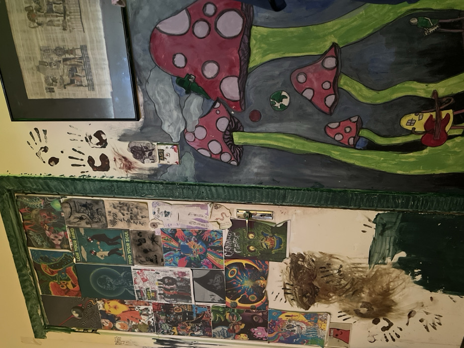 An interior scene is depicted within a structure in Ballyjamesduff, Ireland, showcasing two adjacent, heavily decorated wall or door surfaces. The left surface, identified as a door by a visible silver handle on its right side, is extensively covered with various printed images and posters. These include psychedelic artwork, abstract designs, and cultural references such as a "CANNIBAL CORPSE" poster and a print featuring the text "LOSE YOUR MIND FIND YOUR SOUL" with two figures in gas masks. The lower portion of this surface exhibits multiple brown, smeared handprints and patches of dark green paint. A dark green, textured door frame separates the left door from the adjacent right wall. The right wall features a hand-painted mural. The dominant elements are several large, red-capped mushrooms with white spots and green stems, set against a dark blue-grey background containing small celestial objects, including a stylized Earth. Figures within the mural include a small green creature positioned atop a mushroom cap, a yellow, house-like figure with legs playing a red guitar at the bottom, and another small green humanoid figure further right at the base. Above the mural, on an off-white wall section, several dark handprints are present. A small sign or sticker labeled "ASS" with an asterisk and a drawing or sticker of a black rose are also affixed. A framed artwork, possibly depicting ancient Egyptian figures on papyrus, hangs on the upper part of this wall segment.